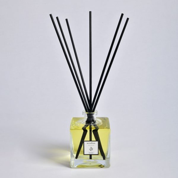 Insert the reeds into the bottle and allow them to absorb the fragrance. Flip the reeds occasionally for a stronger scent.
